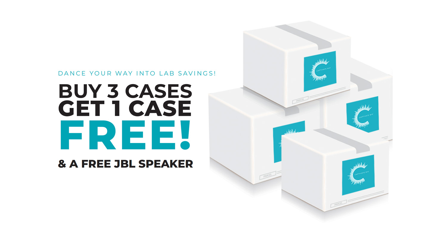 Buy 3 cases of Captivate Bio labware, salt solutions, or water and get 1 case FREE + a free JBL speaker!