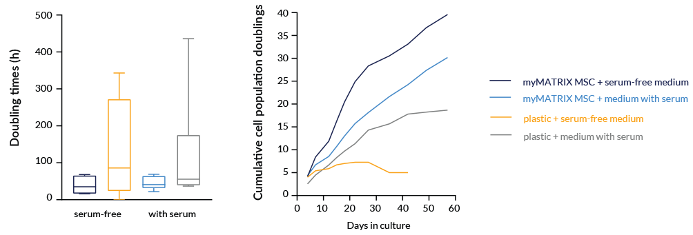 Figure 1. Cell doubling and population comparison. Bone marrow-derived hMSC grown on myMATRIX MSC or tissue culture treated plastic in serum-containing or serum-free medium. Using myMATRIX MSC results in shorter doubling times (in hours (h), left) and higher cumulative population doublings (right).